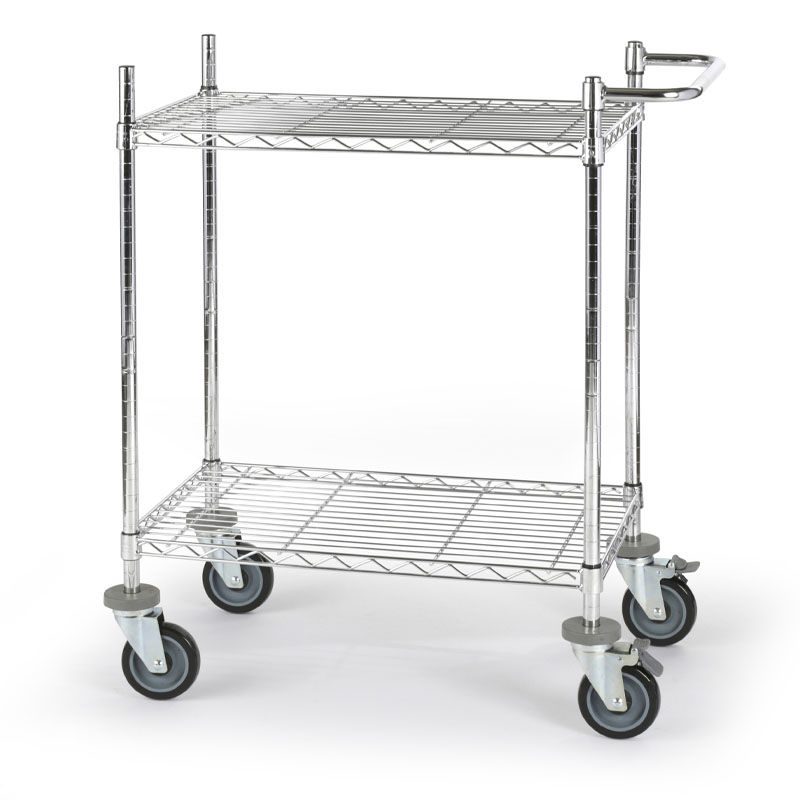 Bordsvagn Allvis, LxBxH 760x460x1025 mm, 2 hyllor, max 300 kg. Gjord i en högklassig förkromning som är slagfast, repfast, lättskött och alltid blänkande. Förkromat skjuthandtag som monteras individuellt. Kan användas överallt, idealisk för intern postutbärning. Hyllplanen kan fininställas i höjd i steg om 25 mm. Skjuthandtaget monteras individuellt. 4 länkhjul i massivgummi med avvisare varav 2 med dubbelbroms, Ø 125 mm. Lastkapacitet totalt 300 kg, 100 kg per hyllplan. Fackindelare som tillbehör.