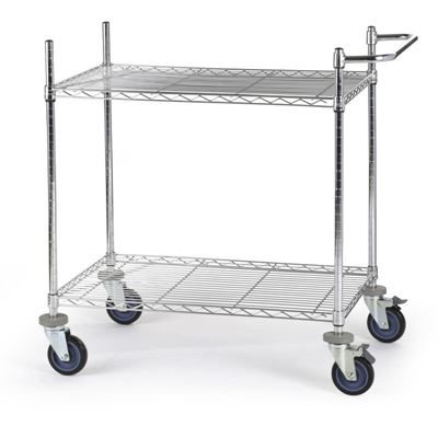 Bordsvagn Allvis, LxBxH 910x610x1025 mm, 2 hyllor, max 300 kg. Gjord i en högklassig förkromning som är slagfast, repfast, lättskött och alltid blänkande. Förkromat skjuthandtag som monteras individuellt. Kan användas överallt, idealisk för intern postutbärning. Hyllplanen kan fininställas i höjd i steg om 25 mm. Skjuthandtaget monteras individuellt. 4 länkhjul i massivgummi med avvisare varav 2 med dubbelbroms, Ø 125 mm. Lastkapacitet totalt 300 kg, 100 kg per hyllplan. Fackindelare som tillbehör.