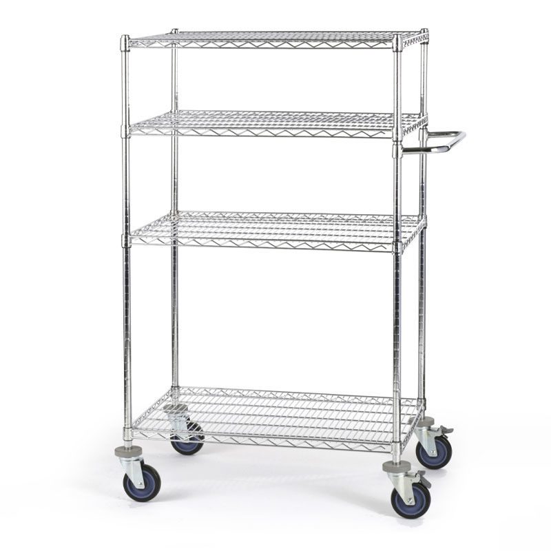 Bordsvagn Allvis, LxBxH 910x610x1350 mm, 4 hyllor, max 300 kg. Gjord i en högklassig förkromning som är slagfast, repfast, lättskött och alltid blänkande. Förkromat skjuthandtag som monteras individuellt. Kan användas överallt, idealisk för intern postutbärning. Hyllplanen kan fininställas i höjd i steg om 25 mm. Skjuthandtaget monteras individuellt. 4 länkhjul i massivgummi med avvisare varav 2 med dubbelbroms, Ø 125 mm. Lastkapacitet totalt 300 kg, 100 kg per hyllplan. Fackindelare som tillbehör.