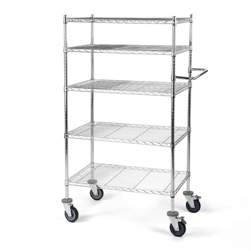Bordsvagn Allvis, LxBxH 910x610x1635 mm, 5 hyllor, max 300 kg. Gjord i en högklassig förkromning som är slagfast, repfast, lättskött och alltid blänkande. Förkromat skjuthandtag som monteras individuellt. Kan användas överallt, idealisk för intern postutbärning. Hyllplanen kan fininställas i höjd i steg om 25 mm. Skjuthandtaget monteras individuellt. 4 länkhjul i massivgummi med avvisare varav 2 med dubbelbroms, Ø 125 mm. Lastkapacitet totalt 300 kg, 100 kg per hyllplan. Fackindelare som tillbehör.