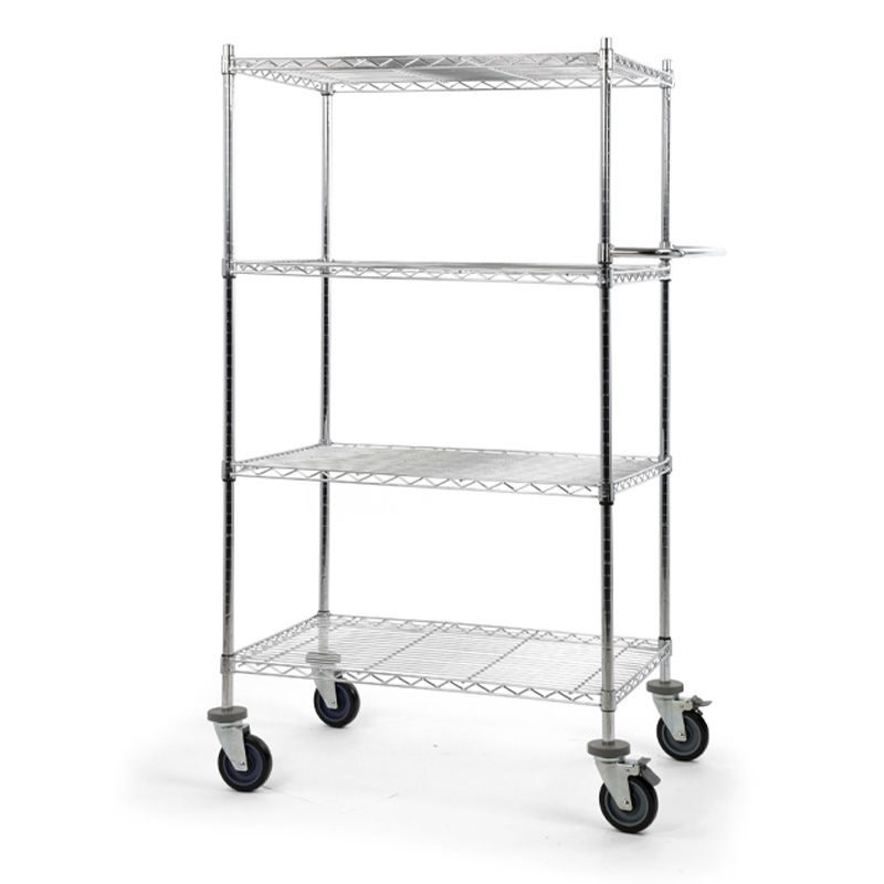 Bordsvagn Allvis, LxBxH 910x610x1670 mm, 4 hyllor, max 300 kg. Gjord i en högklassig förkromning som är slagfast, repfast, lättskött och alltid blänkande. Förkromat skjuthandtag som monteras individuellt. Kan användas överallt, idealisk för intern postutbärning. Hyllplanen kan fininställas i höjd i steg om 25 mm. Skjuthandtaget monteras individuellt. 4 länkhjul i massivgummi med avvisare varav 2 med dubbelbroms, Ø 125 mm. Lastkapacitet totalt 300 kg, 100 kg per hyllplan. Fackindelare som tillbehör.