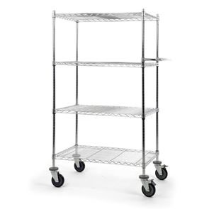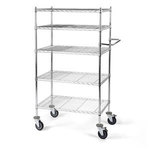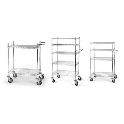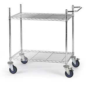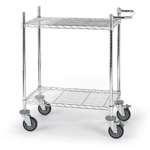 Bordsvagn Allvis med hyllplan. Gjord i en högklassig förkromning som är slagfast, repfast, lättskött och alltid blänkande. Förkromat skjuthandtag som monteras individuellt. Kan användas överallt, idealisk för intern postutbärning. Hyllplanen kan fininställas i höjd i steg om 25 mm. Skjuthandtaget monteras individuellt. 4 länkhjul i massivgummi med avvisare varav 2 med dubbelbroms, Ø 125 mm. Lastkapacitet totalt 300 kg, 100 kg per hyllplan. Fackindelare som tillbehör.
