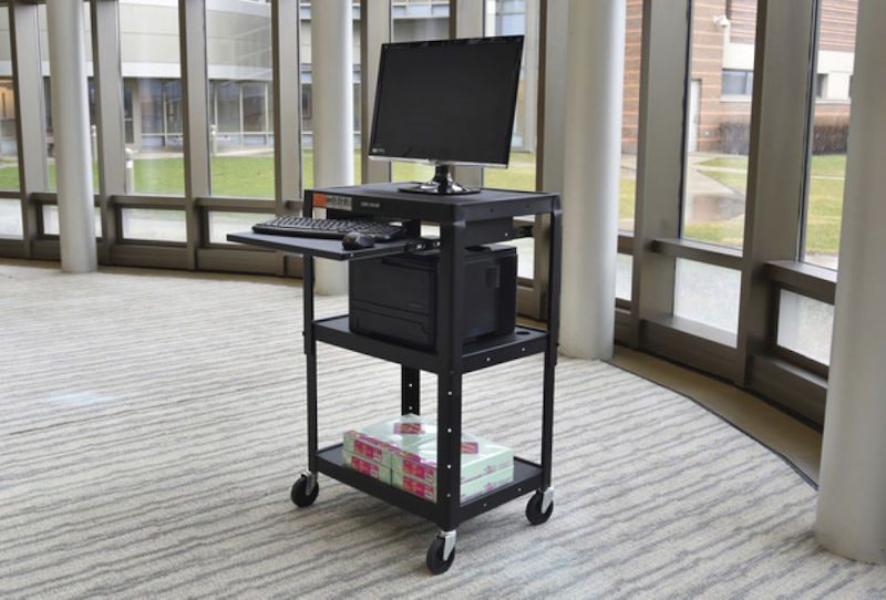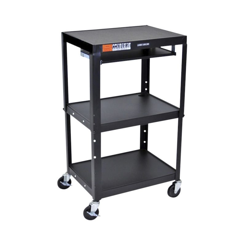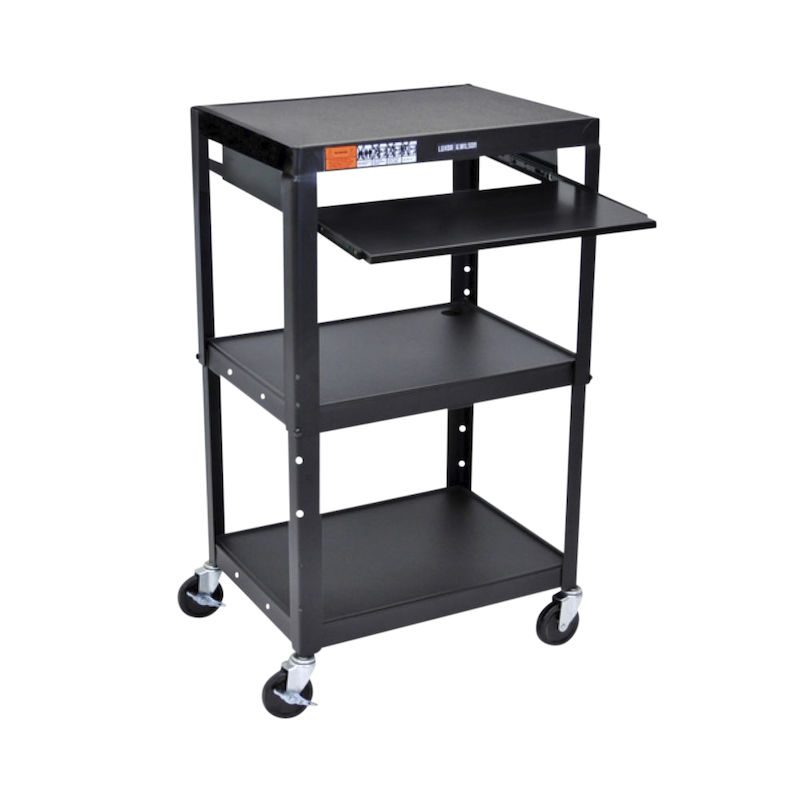 Vagnens höjd kan justeras individuellt i steg om 5 cm. Halkskyddsmattor och en 0,6 cm hög omgivande kantlist håller föremål säkert på plats under transport eller arbete. Det utdragbara hyllplanet passar utmärkt för bärbara datorer, tangentbord eller dokument som enkelt kan skjutas undan när de inte används.