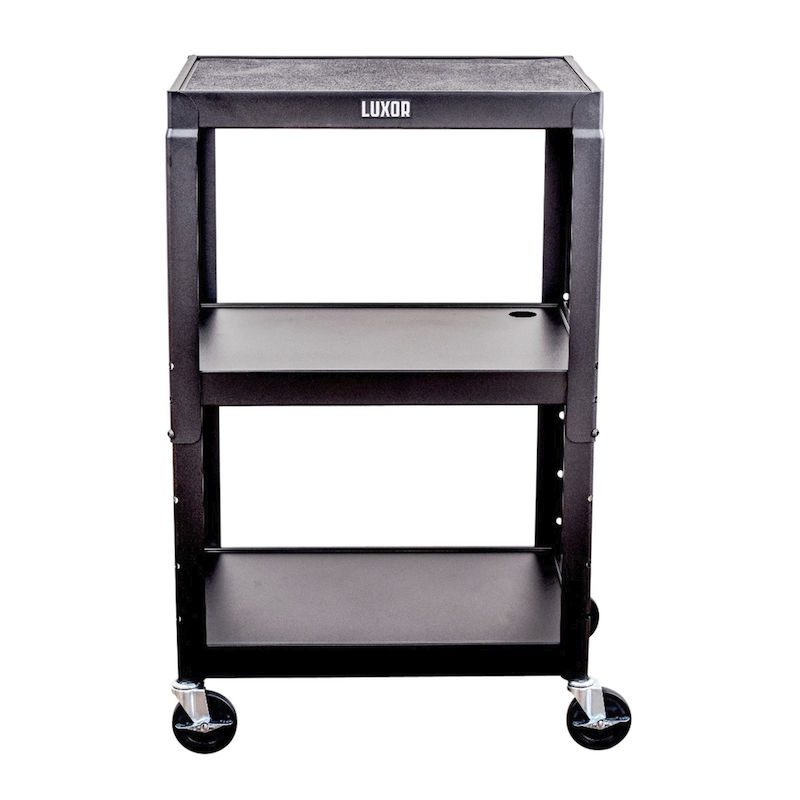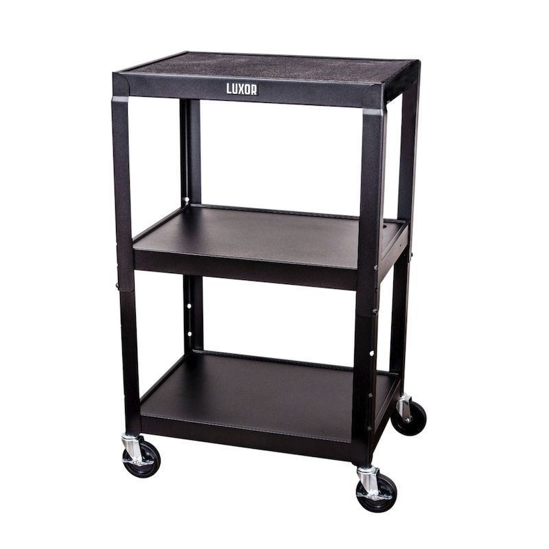 Bordsvagn Nomi, 3 hyllplan, svart stativ. Luxor metallvagn med låsbart underskåp är en stabil och hållbar lösning för intern transport. Den robusta stålkonstruktionen med svetsade hyllplan garanterar lång livslängd – även i krävande miljöer. Varje hyllplan har en lastkapacitet på 45 kg.