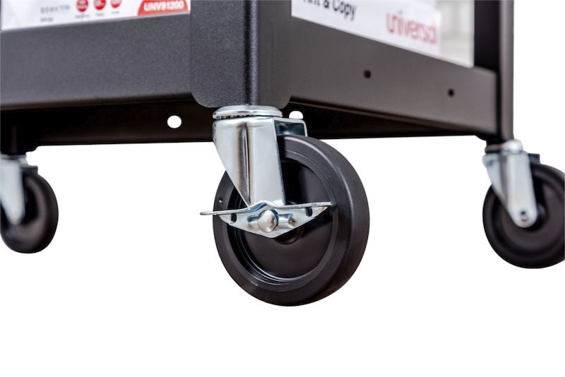 Vagnen har justerbar höjd och fyra lättmanövrerade länkhjul – två av hjulen är utrustade med broms och kan låsas för att hålla vagnen stabilt på plats.