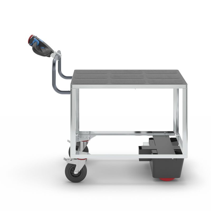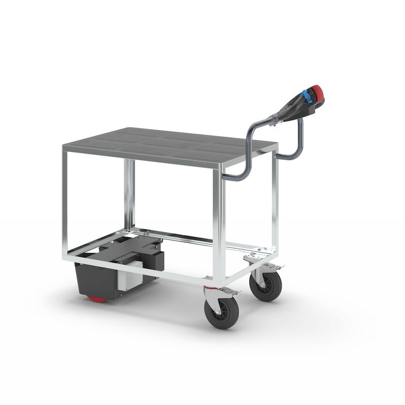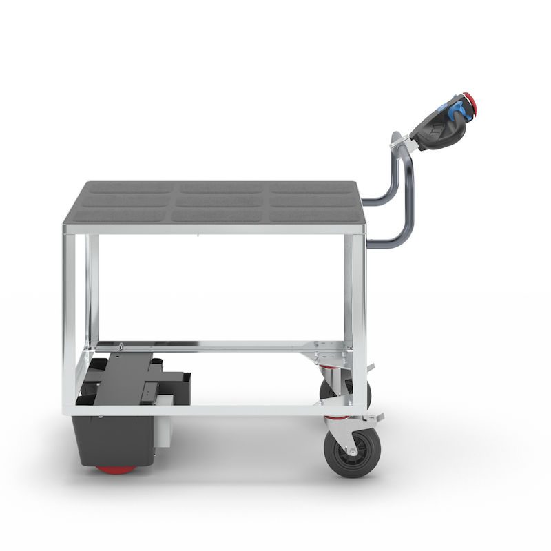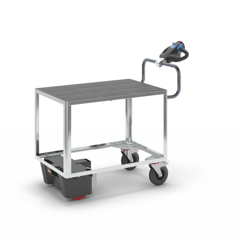 Eldriven Rullvagn Edessa, 1 hyllplan av plast, LxBxH 1470 x 700 x 1300 mm, galvaniserad. Vår högpresterande elmodul NEO redan kombinerad med vår hyllvagn. Redo att användas.