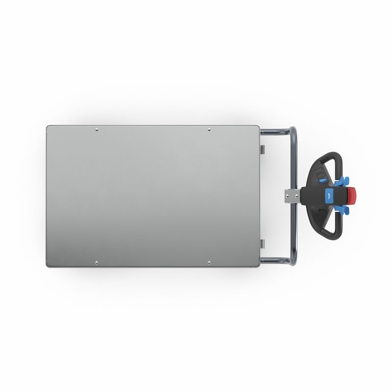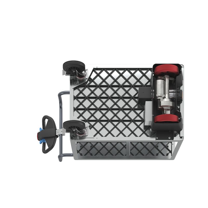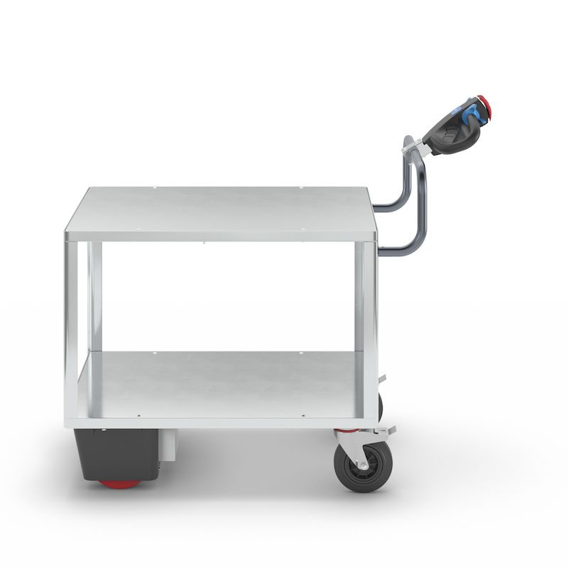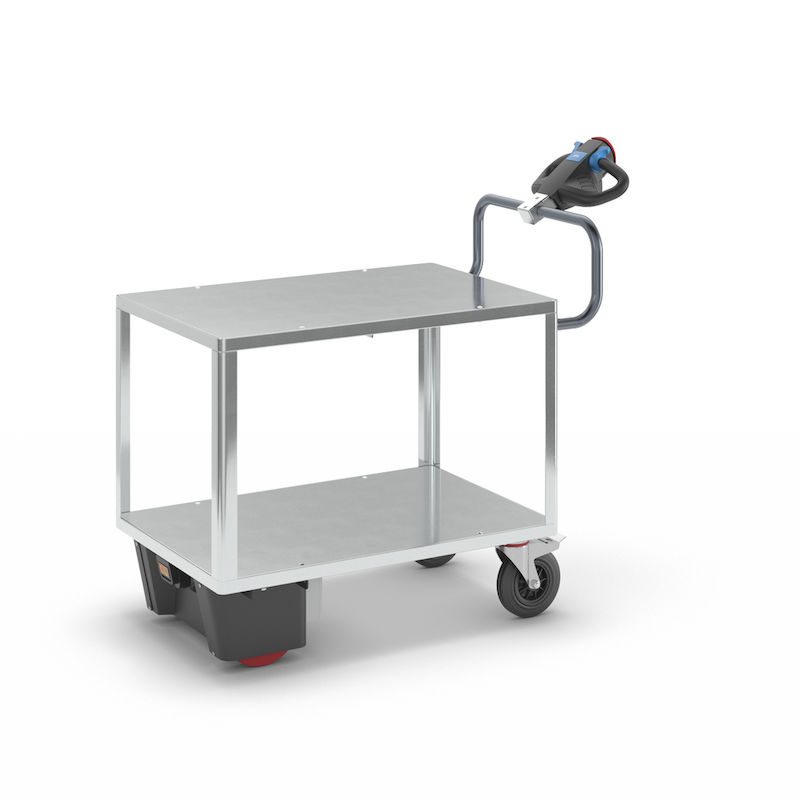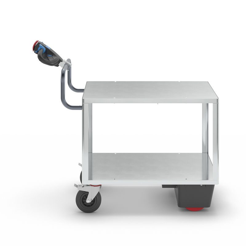 Eldriven Rullvagn Edessa, 2 hyllplan galvaniserade, LxBxH 1470 x 700 x 1300 mm, galvaniserad. Vår högpresterande elmodul NEO redan kombinerad med vår hyllvagn. Redo att användas.