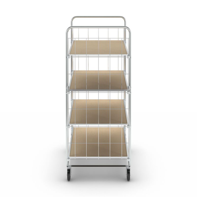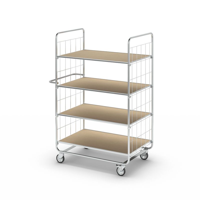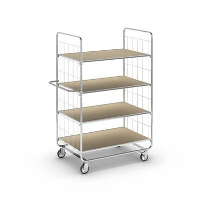 BeskrivningHyllvagn Telma ESD, korta varianter, 4 länkhjul, 4 hyllor, LxBxH 815 x 470 x 1120 mm, 2 med broms, från 5 st