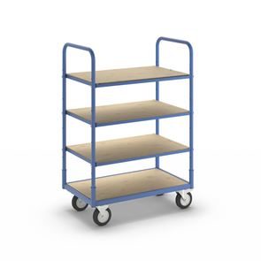 Hyllplanen i plywood kan justeras i höjd eller tas bort vid behov för smidigare lastning och lossning. Tack vare sin robusta konstruktion ger de en stabil yta för många olika typer av gods. Fyra lättrullande länkhjul, varav två med broms, gör vagnen lätt att manövrera och säker att parkera. De slagtåliga massiva gummihjulen jämnar ut ojämnheter och ger en tyst och stabil gång även på ojämna underlag. Hyllvagnen Flex eurokraft basic är därför ett utmärkt val för lager, produktion och plockområden där flexibel och mobil förvaring samt transport krävs.