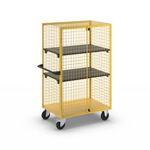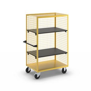 Rullvagn Klas. Komplett med blanka hyllplan av MDF-skiva, svart. Ställbar i steg om 50 mm. Lastkapacitet per hylla, 50 kg. Gallerväggarnas maskstorlek 50 x 50 mm. Botten i stålplåt.