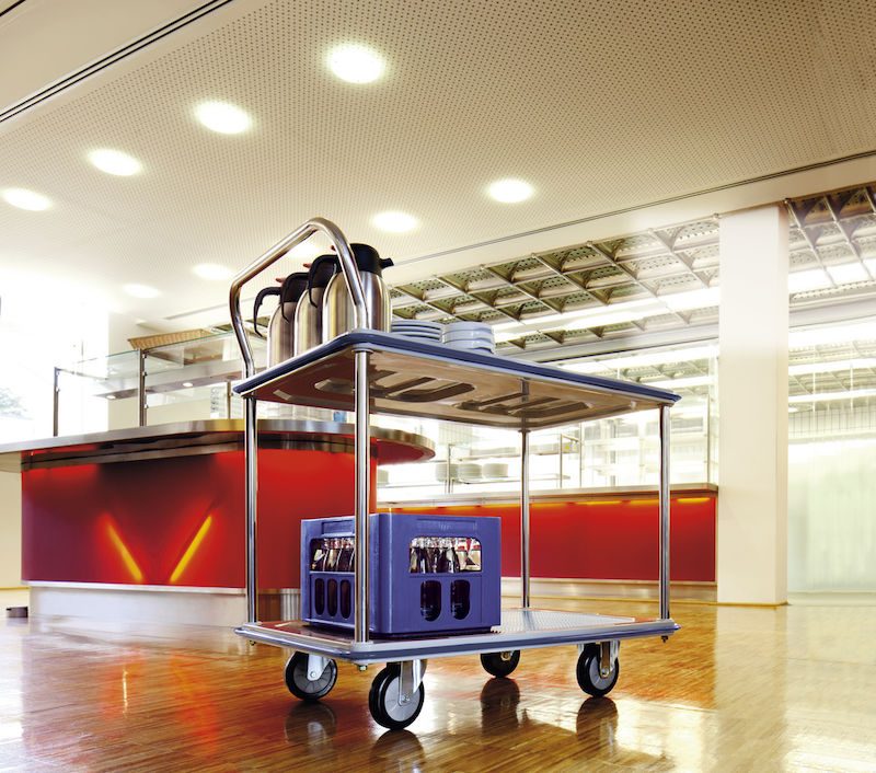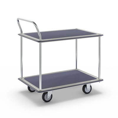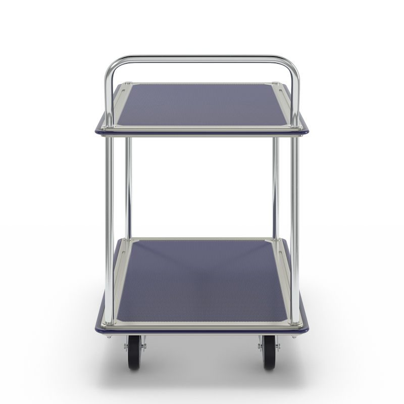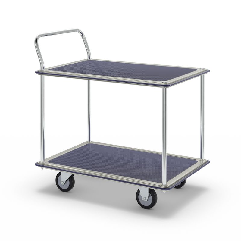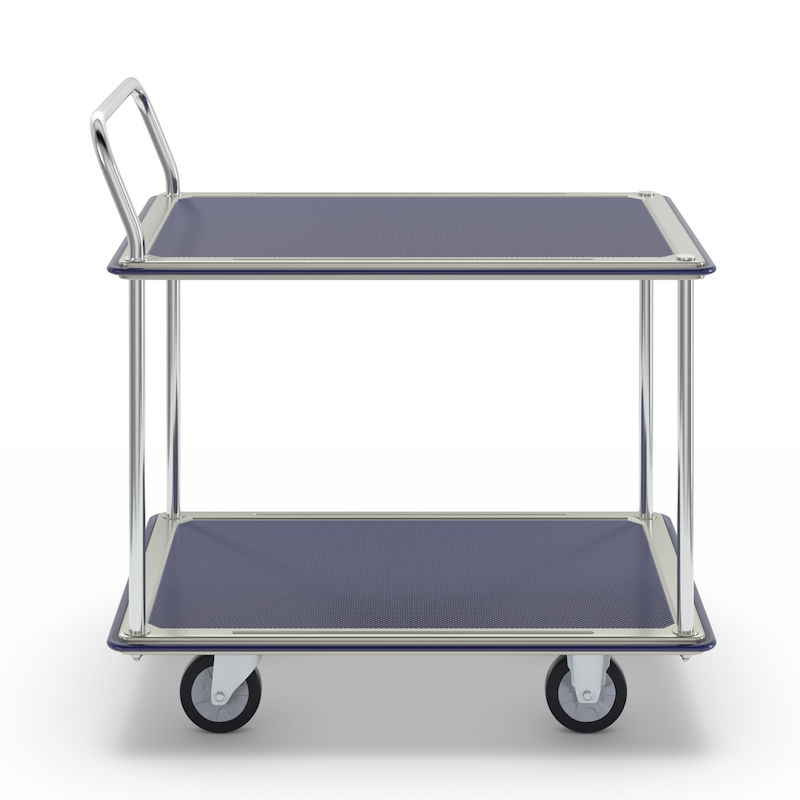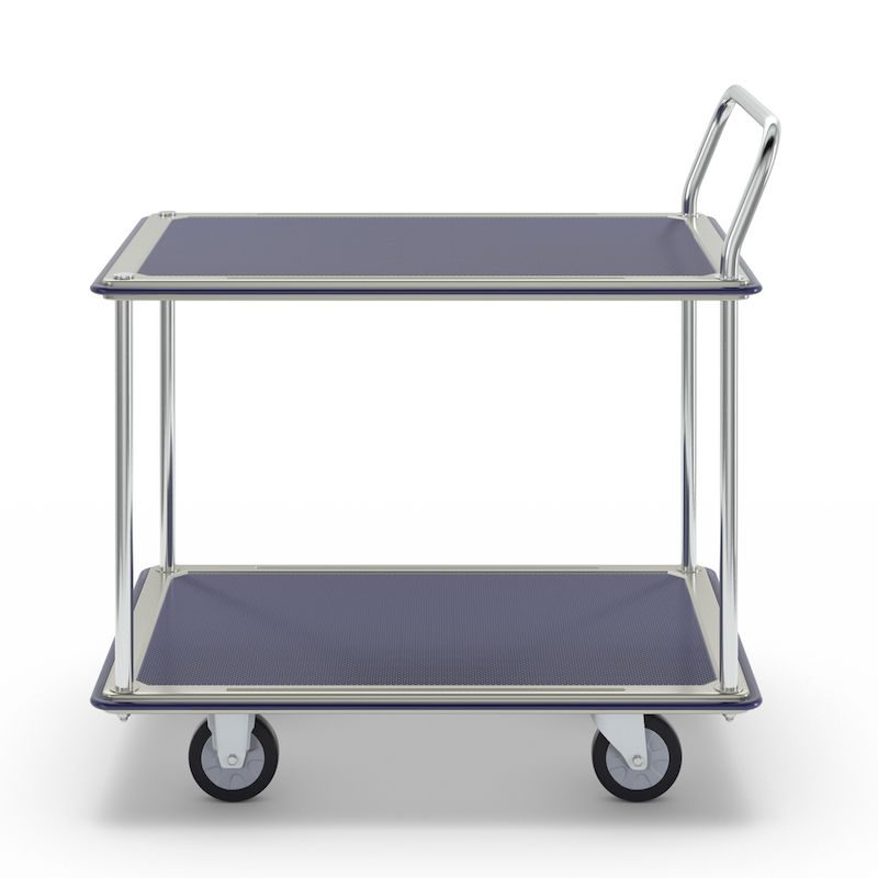 BeskrivningRullvagn Mateo, 2 hyllplan med glidskydd, 1 skjutbygel, lastkapacitet 250 kg, stötskyddsprofil