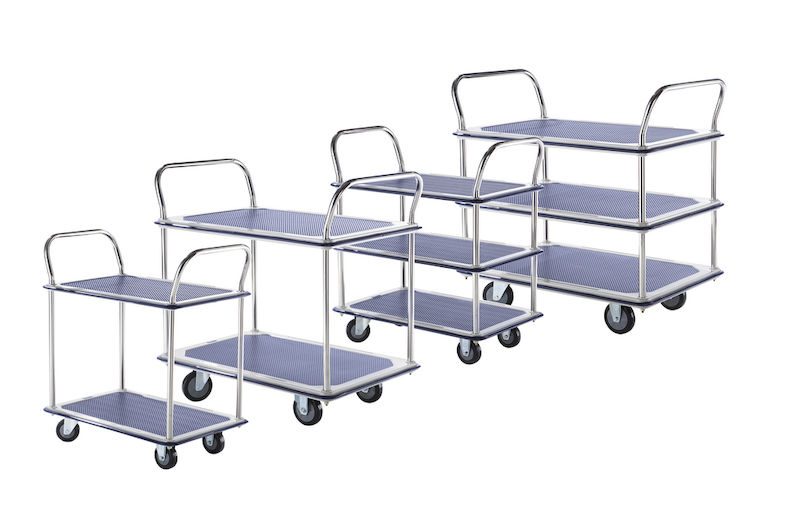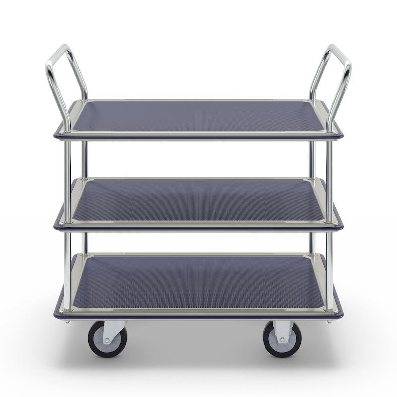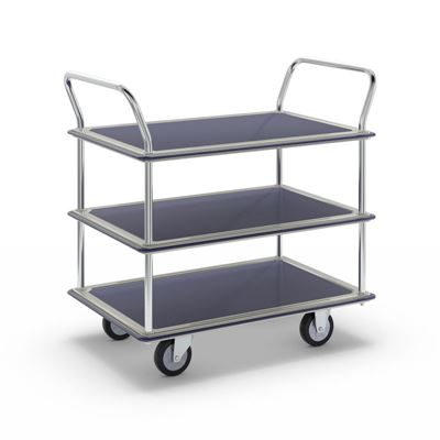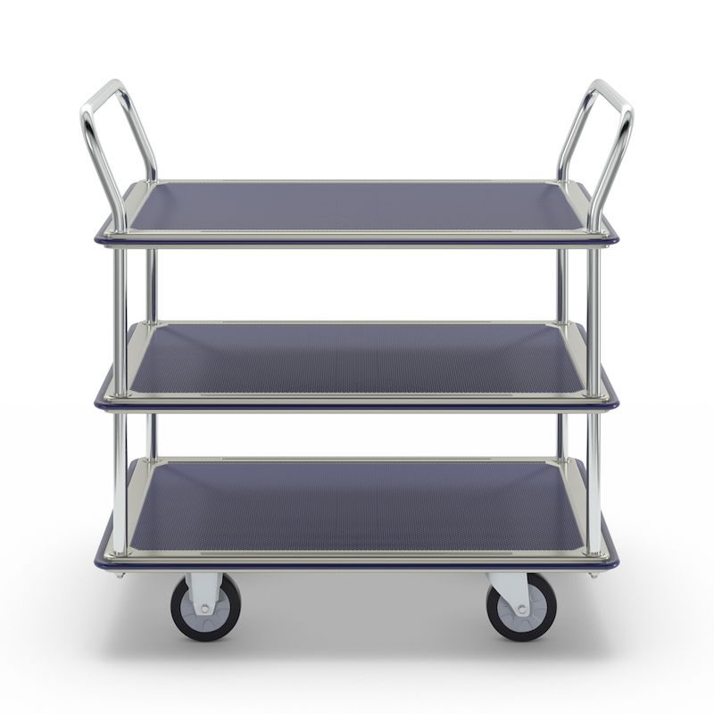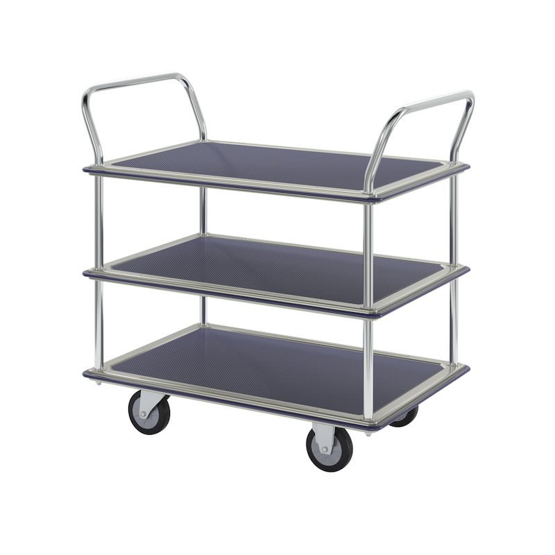BeskrivningRullvagn Mateo, 3 hyllplan med glidskydd, 2 skjutbyglar, lastkapacitet 250 kg
