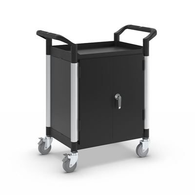 Rullvagn Pelle, med 2 sidoväggar, 1 bakvägg, pardörrar, 2 hyllplan, LxBxH 850 x 480 x 950 mm. Hyllplan och skjutbyglar av plast. Förstärkta förbindelserör av aluminium. Stabila väggar av metall.