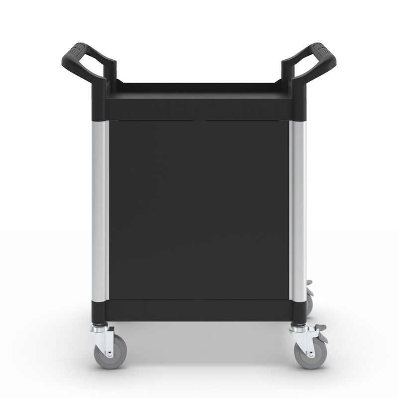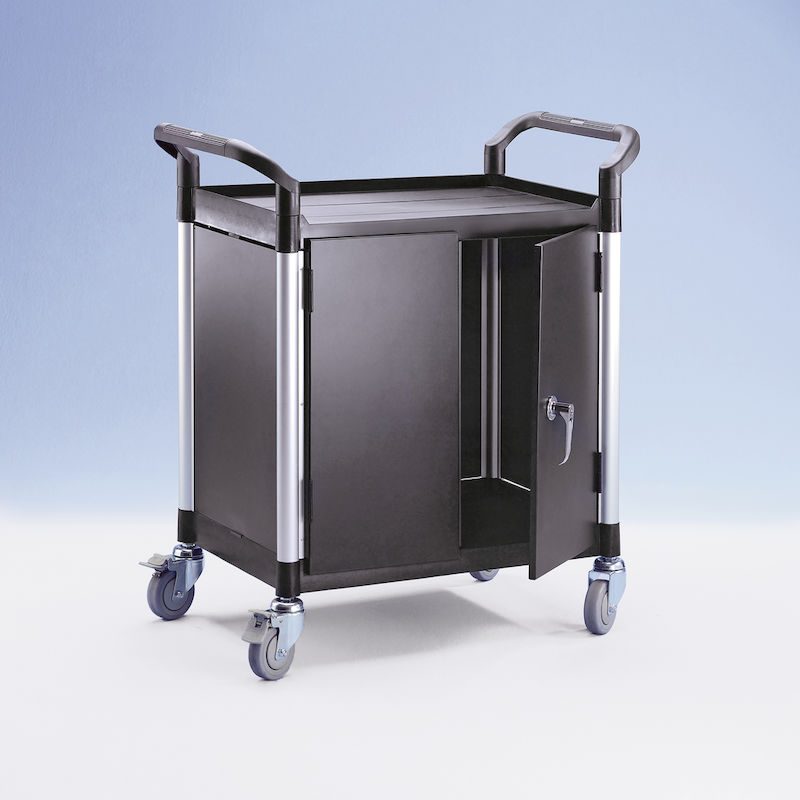 BeskrivningRullvagn Pelle, med 2 sidoväggar, 1 bakvägg, pardörrar, 2 hyllplan, LxBxH 850 x 480 x 950 mm