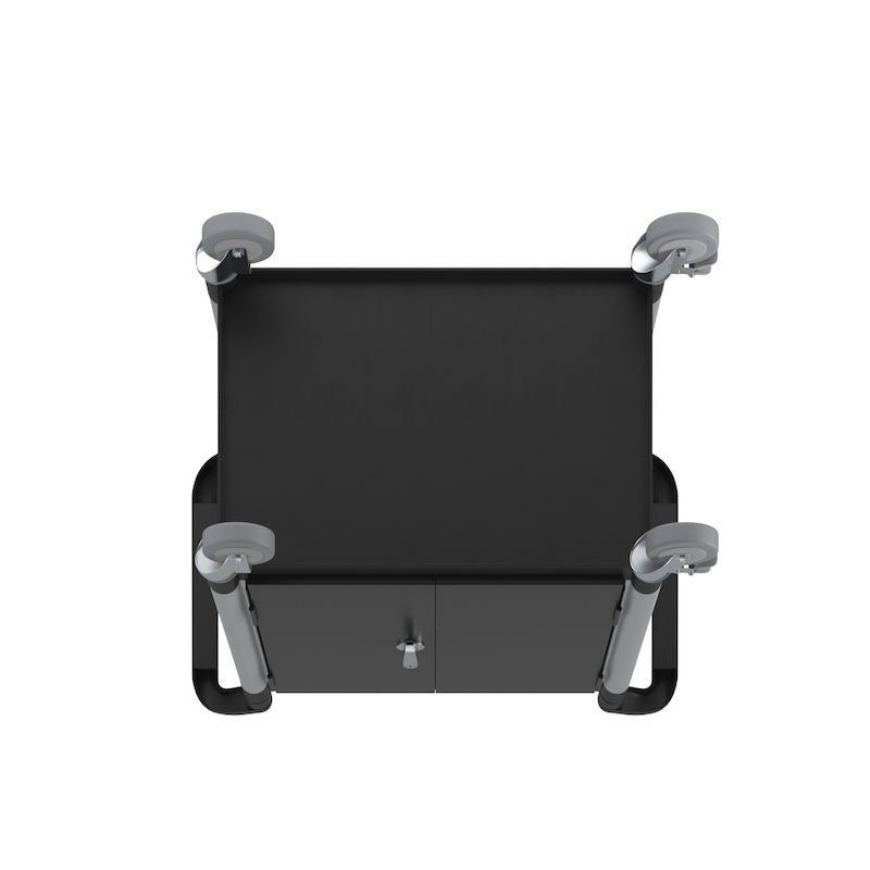 4 länkhjul med kullager, 2 med dubbelbroms. Hjul-Ø 100 mm. Massivgummihjul som inte lämnar märken.
