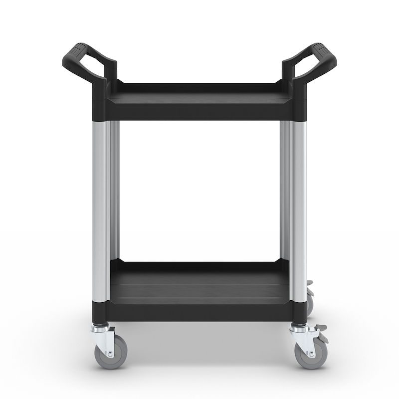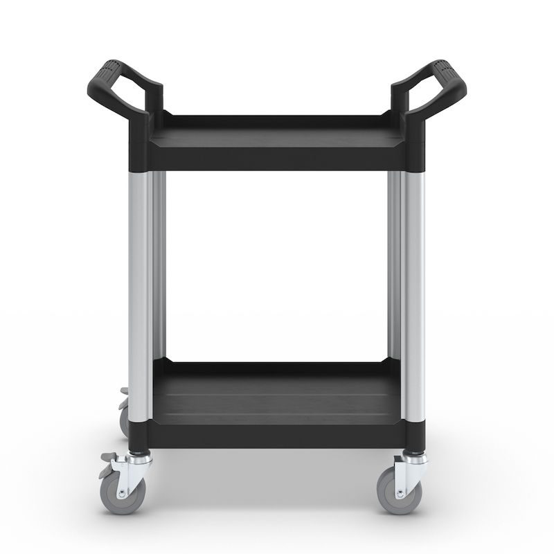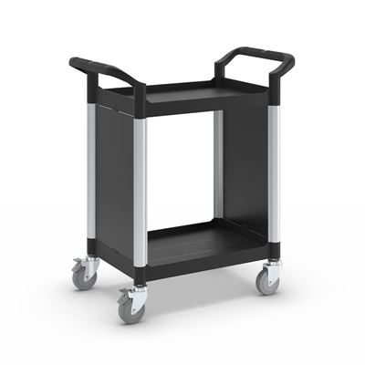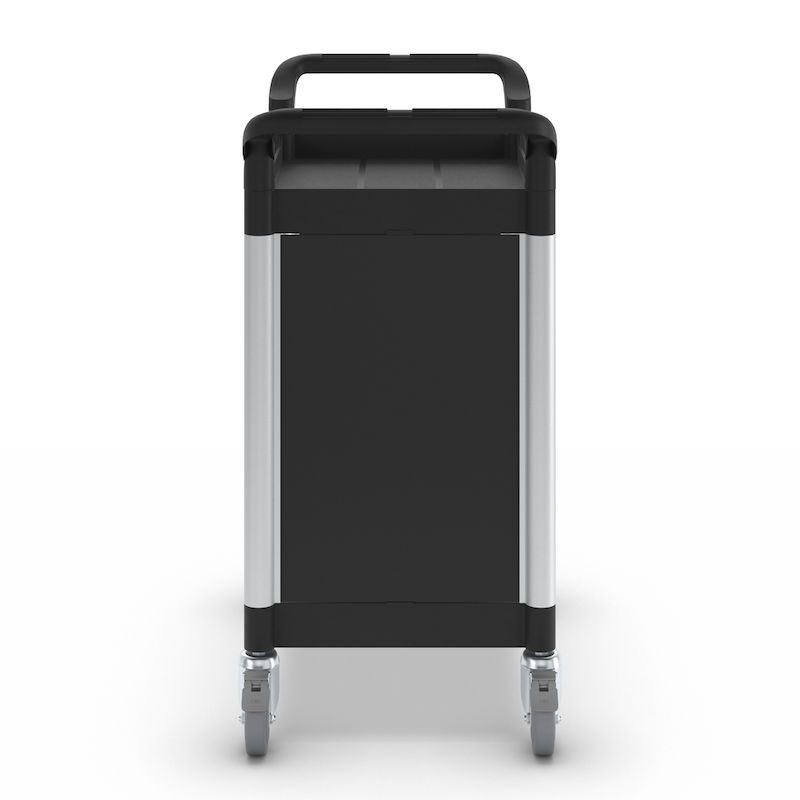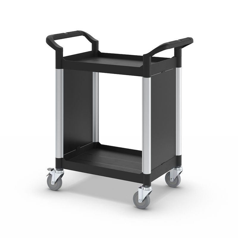 Rullvagn Pelle, med 2 sidoväggar, 2 hyllplan, LxBxH 850 x 480 x 950 mm. Hyllplan och skjutbyglar av plast. Förstärkta förbindelserör av aluminium. Stabila väggar av metall.