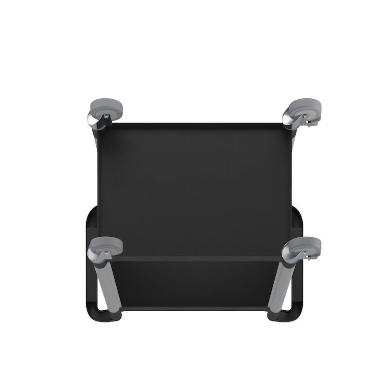 4 länkhjul med kullager, 2 med dubbelbroms. Hjul-Ø 100 mm. Massivgummihjul som inte lämnar märken.