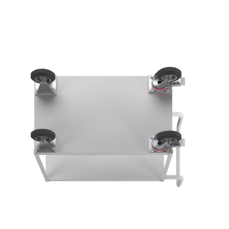Rullvagn Lovis, hyllplan med uppvikt kant, 2 hyllplan. Allroundbord för produktion och verkstad. Hyllhöjd 275/895 mm. ESD-utförande – galvaniserat. Lastytor av förzinkad stålplåt. Lastytorna är fodrade med en träskiva som bullerdämpning.