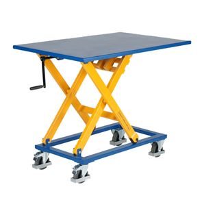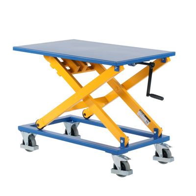Manuell lyftbordsvagn där höjden justeras med vev, inställbar höjd 410-1050 mm.