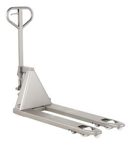 Gaffelvagn med trepositionshandag tillverkad helt av rostfritt stål. Utrustad med hjul av nylon vilket gör att gaffelvagnen rullar lätt även vid tung lastning.