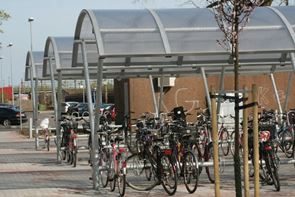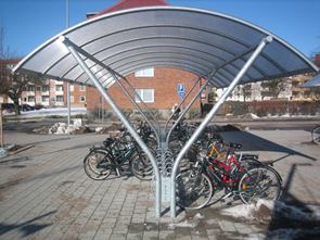 Cykelgarage med stomme av varmförzinkade stålprofiler och tak av klar kanalplast.