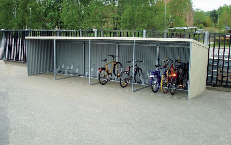 Monteringsfärdigt cykelgarage som levereras i färdiga byggsatser med plåten monterad, vilket gör slutmonteringen mycket enkel. Kan även levereras utan gavlar och baksida.