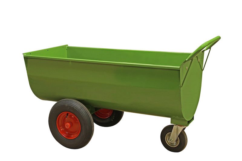 Den gröna pulverlackeringen (RAL 6010) ger långvarigt rostskydd. Den medföljande mineralbehållaren kompletterar vagnen både funktionellt och effektivt.