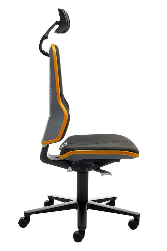 Arbetsstol Ela, synkrongunga, tyg, flexband orange. Denna flexibla arbetsstol är idealisk för dator-, installations- och kontrollarbetsplatser. Höjd, djup och lutning på nackstödet kan ställas in bekvämt medan man sitter. Nackstöden med mjuk stoppning och konstläderklädsel är avtorkningsbara och lätta att rengöra. Den generösa stoppningen ger hög sittkomfort och det ergonomiskt utformade ryggstödet ger maximal rörelsefrihet. Ett flexband skyddar både stolen och omgivningen.
