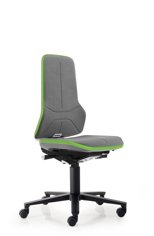 Arbetsstol Elif, permanentkontakt, Supertec, flexband grönt. Sits och ryggstöd kan ha klädsel i tyg, konstläder, PU-skum eller Supertec®. Tygklädsel är luftig, mjuk och slitstark medan konstläderklädseln är avtorkningsbar, mjuk och lättskött. Även klädseln i PU-skum är avtorkningsbar samt extremt motståndskraftig i krävande miljöer och lätt att rengöra. Supertec®-klädseln med noppig struktur är extremt nötnings- och rivtålig samt lätt att rengöra. Flexbandet som utgör kantskydd finns i färgerna grått, grönt och orange.