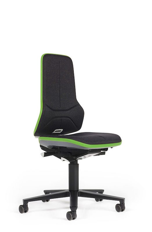 Arbetsstol Elif, synkrongunga, tyg, flexband grönt. Sits och ryggstöd kan ha klädsel i tyg, konstläder, PU-skum eller Supertec®. Tygklädsel är luftig, mjuk och slitstark medan konstläderklädseln är avtorkningsbar, mjuk och lättskött. Även klädseln i PU-skum är avtorkningsbar samt extremt motståndskraftig i krävande miljöer och lätt att rengöra. Supertec®-klädseln med noppig struktur är extremt nötnings- och rivtålig samt lätt att rengöra. Flexbandet som utgör kantskydd finns i färgerna grått, grönt och orange.