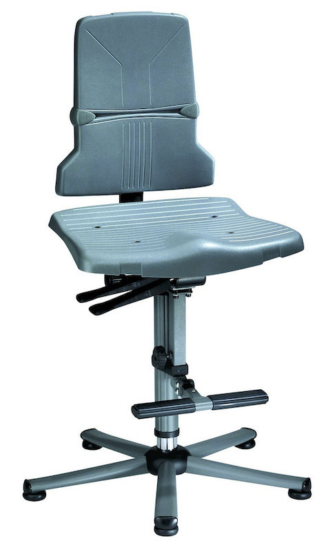 BeskrivningArbetsstol Joakim, synkrongunga, stålrörsstativ, fem ben med glidfötter och trappsteg