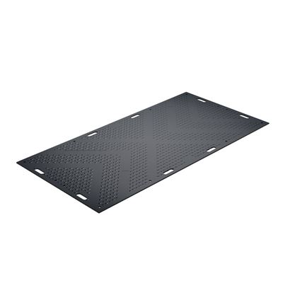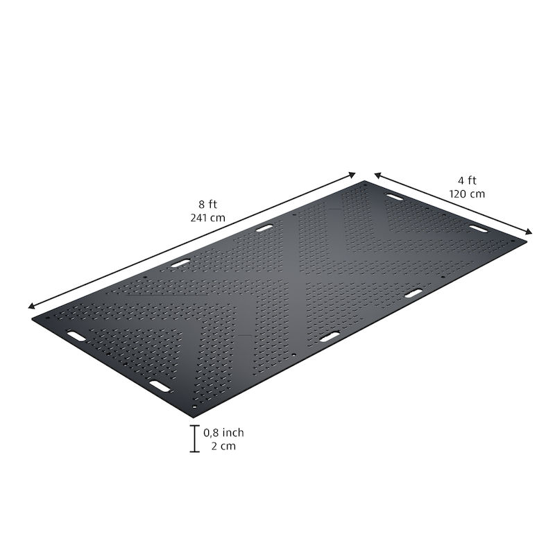Gummimatta MambaMAT, LxB 2440 x 1220 mm, svart. MambaMAT golvskyddsmatta för tung last ger pålitligt skydd under krävande förutsättningar genom att skapa trygga gång- och körvägar på mjuk mark, fuktig jord eller ojämna underlag. Den är konstruerad för maximal stabilitet under extrema förhållanden och har en bärförmåga på upp till 95 ton – tillräckligt för tunga bygg- och anläggningsfordon.