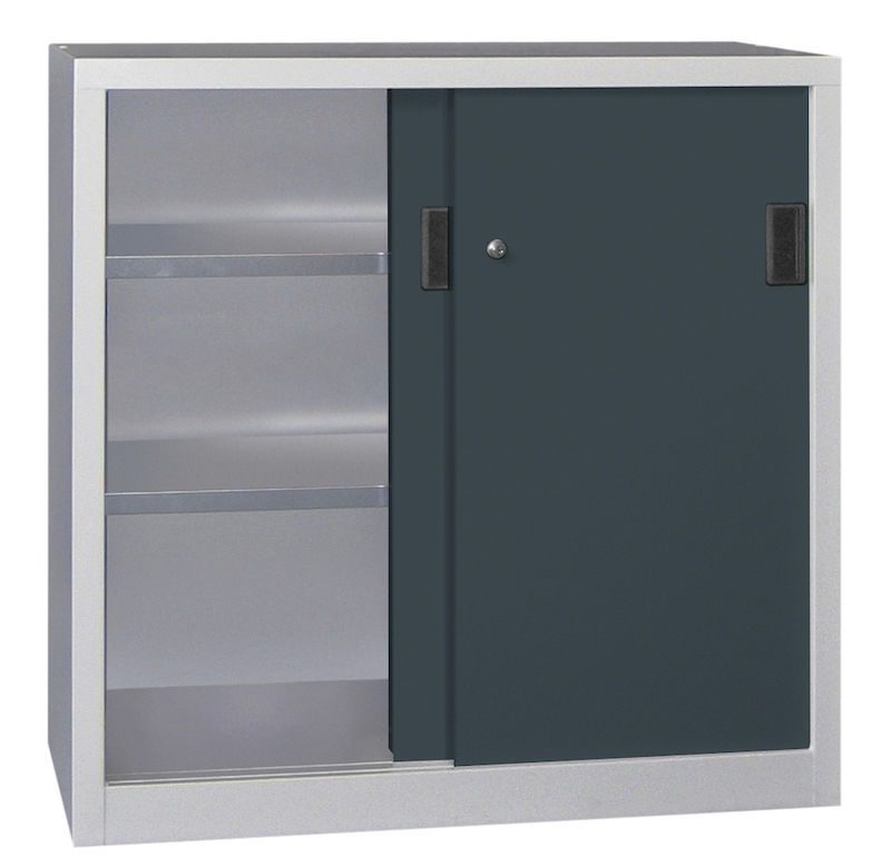 BeskrivningVerkstadsskåp med skjutdörrar Ellinor, höjd 1000 mm, dörrar helt i plåt, BxD 1000 x 600 mm, med 2 hyllplan, dörr antracit