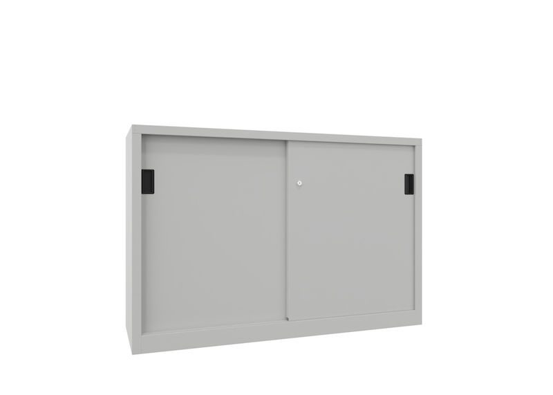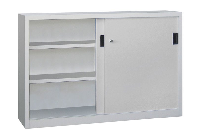 BeskrivningVerkstadsskåp med skjutdörrar Ellinor, höjd 1000 mm, dörrar helt i plåt, BxD 1500 x 400 mm, med skiljevägg och 2 x 2 hyllplan, dörr ljusgrå