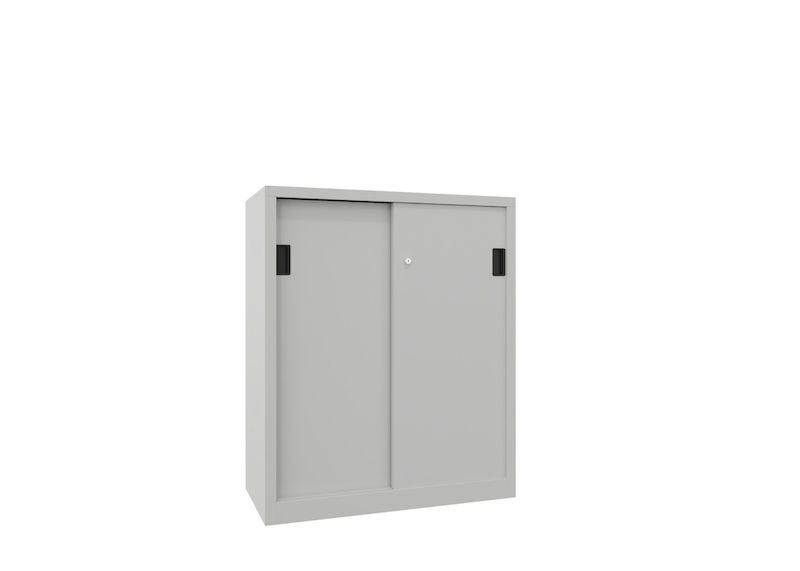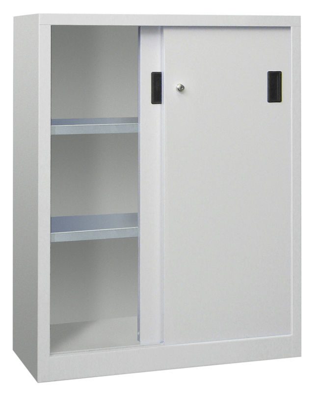 BeskrivningVerkstadsskåp med skjutdörrar Ellinor, höjd 1200 mm, dörrar helt i plåt, BxD 1000 x 500 mm, med 2 hyllplan, dörr ljusgrå