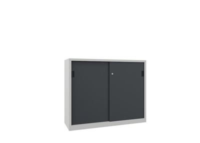 BeskrivningVerkstadsskåp med skjutdörrar Ellinor, höjd 1200 mm, dörrar helt i plåt, BxD 1500 x 500 mm, med skiljevägg och 2 x 2 hyllplan, dörr antracit