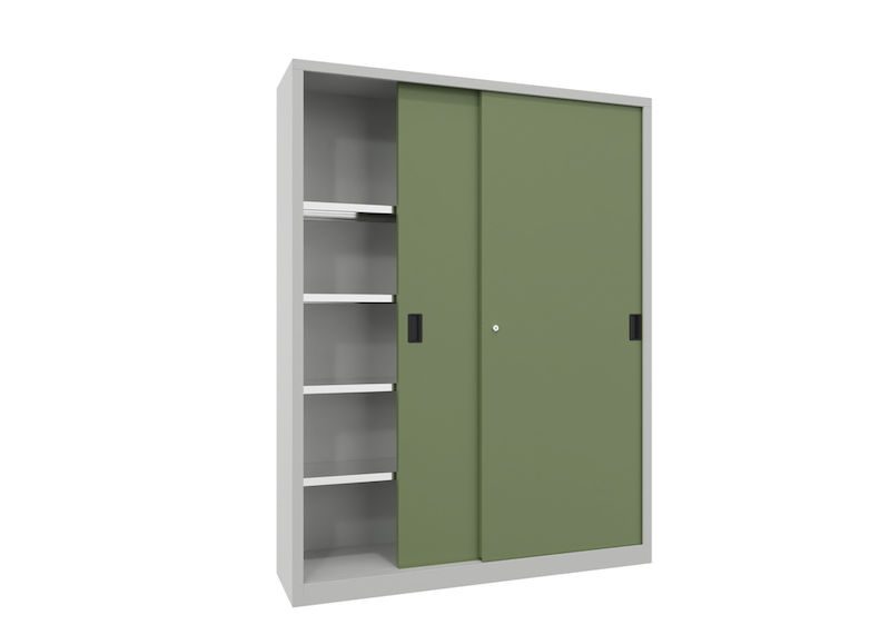 BeskrivningVerkstadsskåp med skjutdörrar Ellinor, höjd 1950 mm, dörrar helt i plåt, BxD 1500 x 400 mm, med skiljevägg och 2 x 4 hyllplan, dörr resedagrön