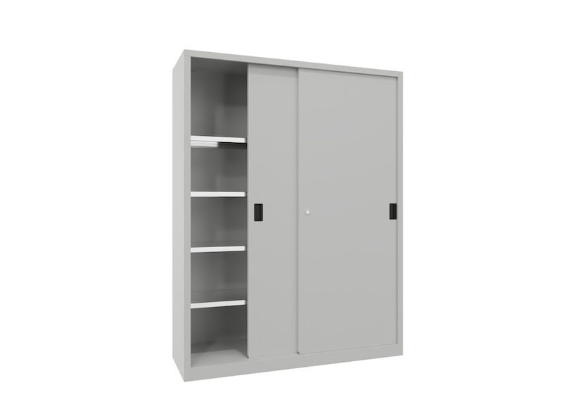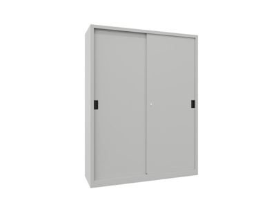 BeskrivningVerkstadsskåp med skjutdörrar Ellinor, höjd 1950 mm, dörrar helt i plåt, BxD 1500 x 500 mm, med skiljevägg och 2 x 4 hyllplan, dörr ljusgrå