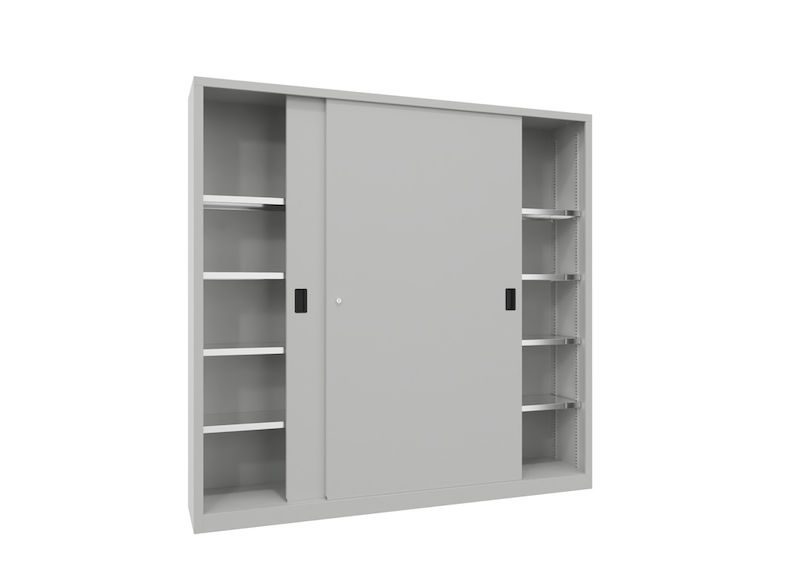 BeskrivningVerkstadsskåp med skjutdörrar Ellinor, höjd 1950 mm, dörrar helt i plåt, BxD 2000 x 400 mm, med skiljevägg och 2 x 4 hyllplan, dörr ljusgrå