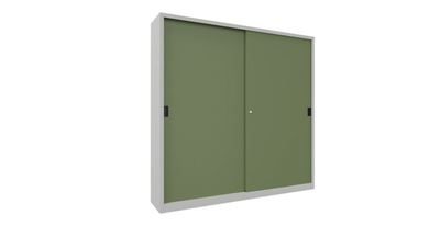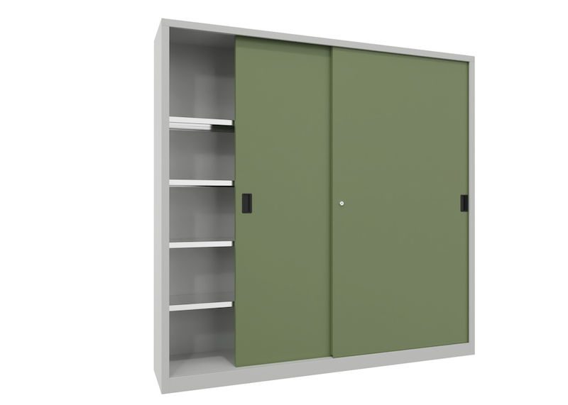 BeskrivningVerkstadsskåp med skjutdörrar Ellinor, höjd 1950 mm, dörrar helt i plåt, BxD 2000 x 400 mm, med skiljevägg och 2 x 4 hyllplan, dörr resedagrön