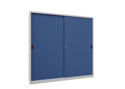 BeskrivningVerkstadsskåp med skjutdörrar Ellinor, höjd 1950 mm, dörrar helt i plåt, BxD 2000 x 500 mm, med skiljevägg och 2 x 4 hyllplan, dörr gentianablå