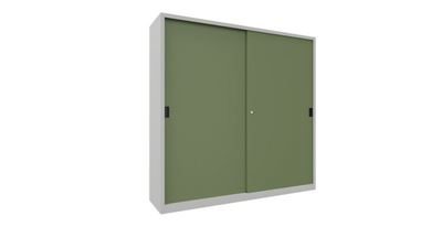BeskrivningVerkstadsskåp med skjutdörrar Ellinor, höjd 1950 mm, dörrar helt i plåt, BxD 2000 x 500 mm, med skiljevägg och 2 x 4 hyllplan, dörr resedagrön