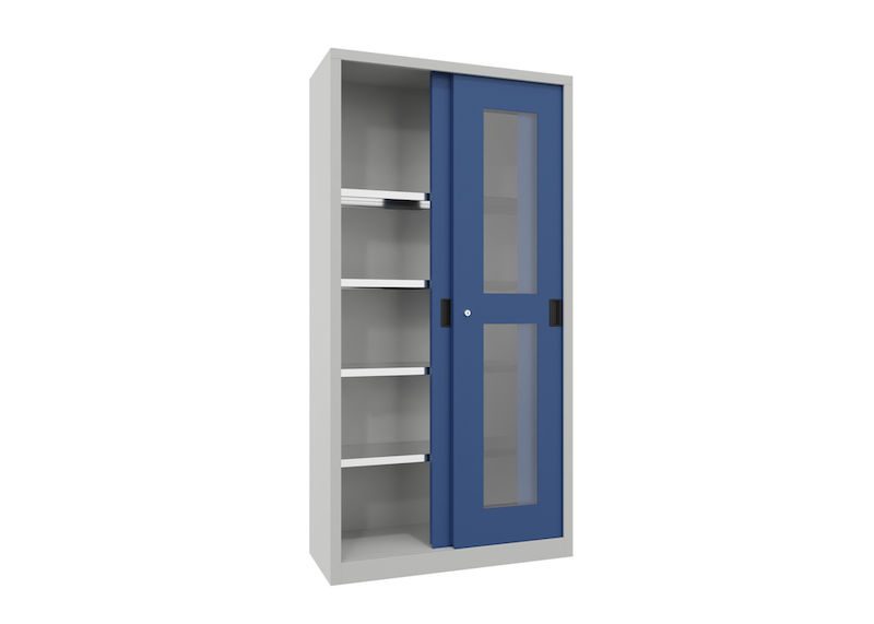 BeskrivningVerkstadsskåp med skjutdörrar Ellinor, höjd 1950 mm, fönsterdörrar, BxD 1000 x 400 mm, med 4 hyllplan, dörr gentianablå