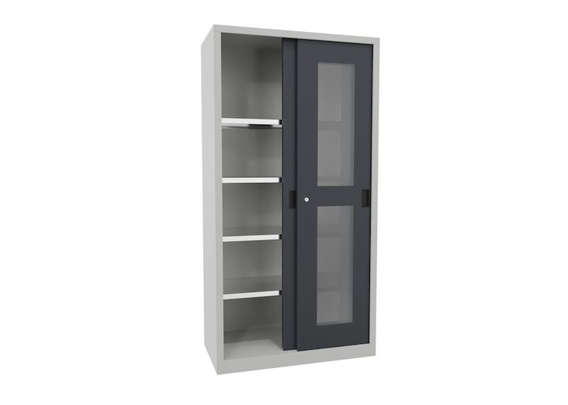 BeskrivningVerkstadsskåp med skjutdörrar Ellinor, höjd 1950 mm, fönsterdörrar, BxD 1000 x 500 mm, med 4 hyllplan, dörr antracit