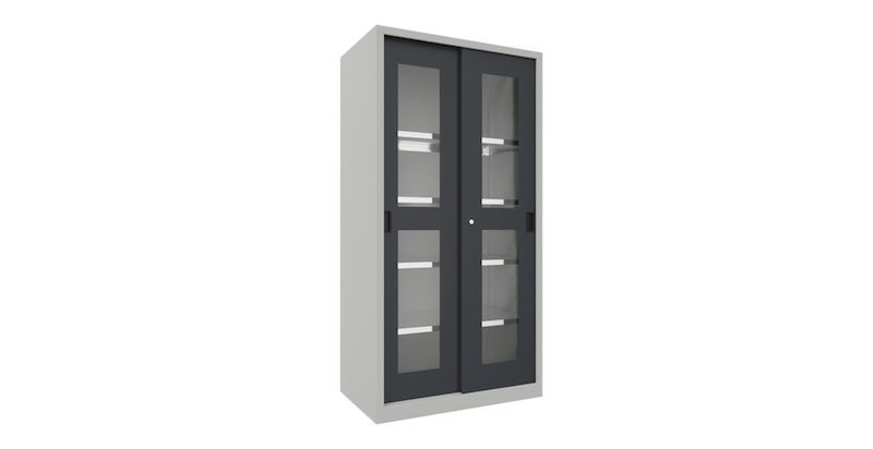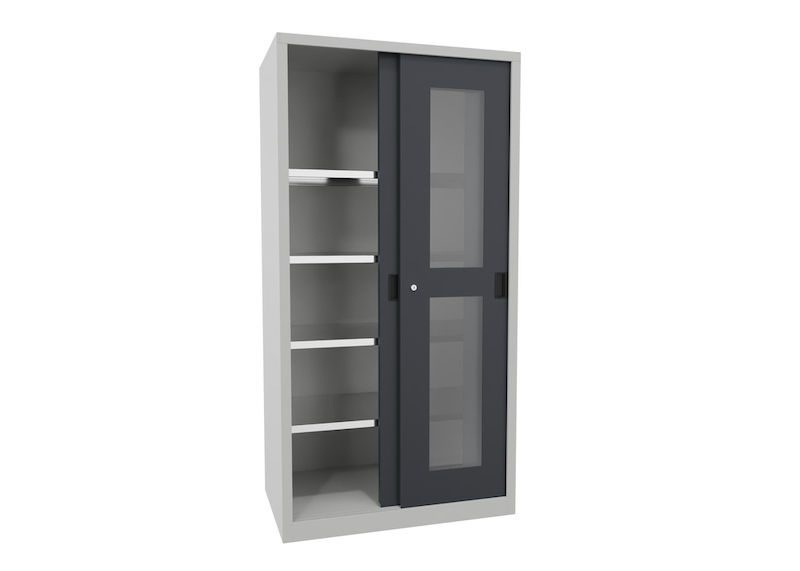 BeskrivningVerkstadsskåp med skjutdörrar Ellinor, höjd 1950 mm, fönsterdörrar, BxD 1000 x 600 mm, med 4 hyllplan, dörr antracit