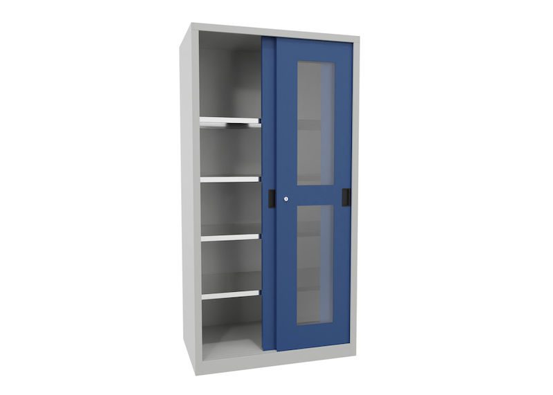 BeskrivningVerkstadsskåp med skjutdörrar Ellinor, höjd 1950 mm, fönsterdörrar, BxD 1000 x 600 mm, med 4 hyllplan, dörr gentianablå