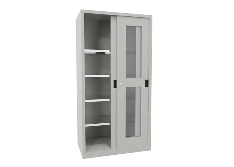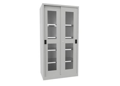 BeskrivningVerkstadsskåp med skjutdörrar Ellinor, höjd 1950 mm, fönsterdörrar, BxD 1000 x 600 mm, med 4 hyllplan, dörr ljusgrå