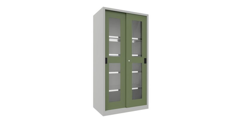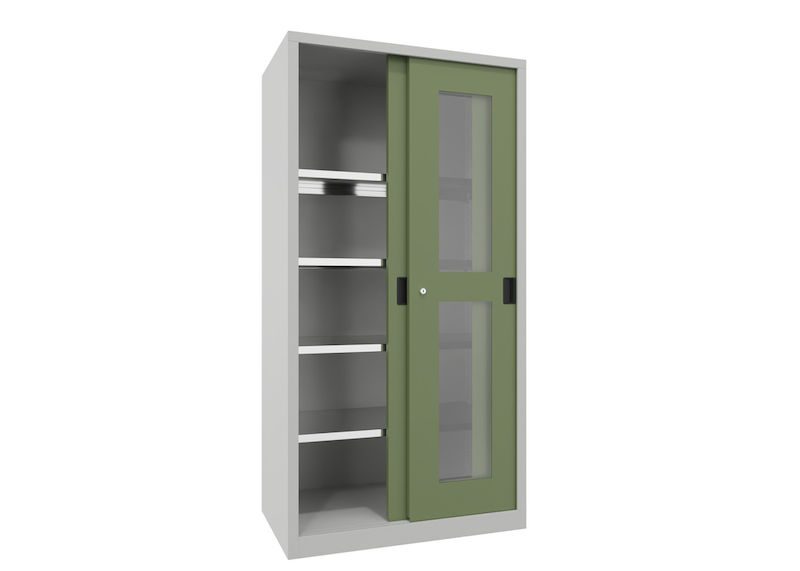 BeskrivningVerkstadsskåp med skjutdörrar Ellinor, höjd 1950 mm, fönsterdörrar, BxD 1000 x 600 mm, med 4 hyllplan, dörr resedagrön