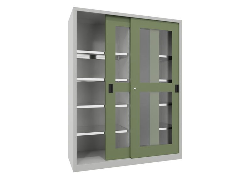 BeskrivningVerkstadsskåp med skjutdörrar Ellinor, höjd 1950 mm, fönsterdörrar, BxD 1500 x 600 mm, med skiljevägg och 2 x 4 hyllplan, dörr resedagrön