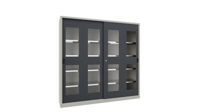 BeskrivningVerkstadsskåp med skjutdörrar Ellinor, höjd 1950 mm, fönsterdörrar, BxD 2000 x 600 mm, med skiljevägg och 2 x 4 hyllplan, dörr antracit